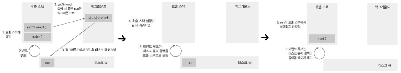- 이벤트가 발생하면 이벤트리스너에 등록한 콜백함수가 호출. 이벤트가 다 처리되면 다음 이벤트를 대기