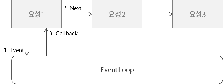 클라이언트의 요청을 비동기로 처리하기 위하여 이벤트가 발생하며 서버 내부에 메시지 형태로 Event Loop에게 전달된다. Event Loop가 클라이언트 요청을 처리하는 동안 제어권은 다음 요청으로 넘어가고 처리가 완료되면 Callback을 호출하여 처리완료를 호출측에 알린다.