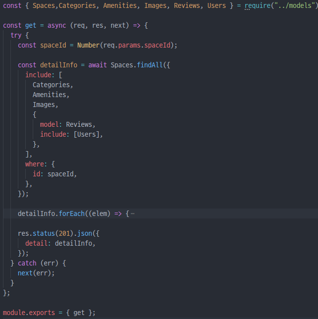 User가 접근 한 URL에 따라서 사용자의 reqeust를 파악한 후에 그 요청에 맞는 데이터를 앞서 정의한 Models로부터 주고 받는 Controller를 정의한다. 예를들어 User가 특정 id값을 가지는 어떤 공간에 대해 상세정보를 조회하고 싶은 경우 상세정보조회 endpoint로 id값을 url parameter와 함께 request를 보내면, models/Space.js에 접근하여 해당 id값을 가지는 공간이 있는 조회 하여 상세정보를 response로 보내 주거나 없는 경우 에러메세지를 전달한다.