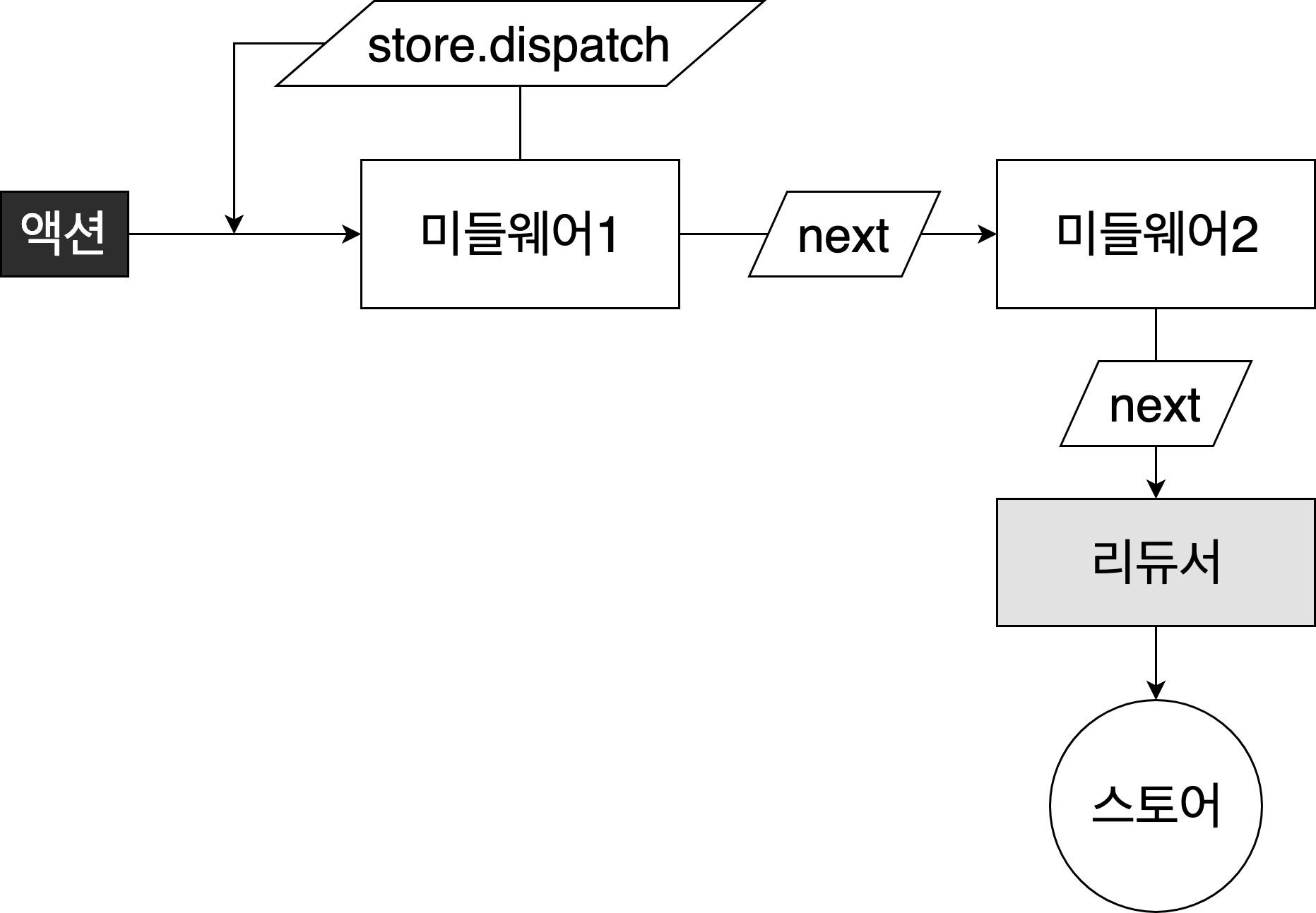 - 리덕스 미들웨어는 액션을 디스패치했을 때 리듀서에서 이를 처리하기에 앞서 사전에 지정된 작업들 실행하는 액션과 리듀서 사이의 중간자