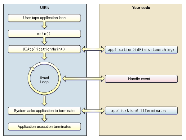 Et launch time, UIKit automatically creates the UIApplication object and your app delegate.