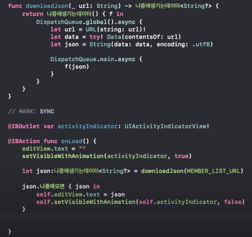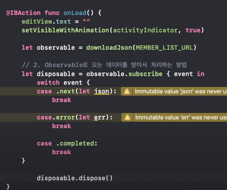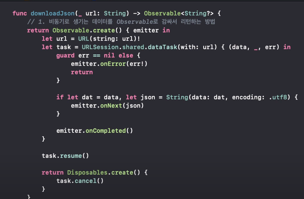 -> Rxswitf๋ ๋น๋๊ธฐ๋ก ์๊ธฐ๋ ๊ฒฐ๊ณผ๊ฐ์ completion์ผ๋ก ์ ๋ฌํ๋๊ฒ์ด ์๋๋ผ return์ผ๋ก ์ ๋ฌํจ์ผ๋ก์จ, ์ฝ๋๋ ๋๊ธฐ์์ผ๋ก ๋ณด์ด์ง๋ง ๋น๋๊ธฐ์ ์ผ๋ก ๋์ค์ ์ํ์ ๋ง์น๊ณ ์๋ฃ๋ ๊ฐ์ ๋ณ์์ ํ ๋นํ ์ ์๋ค!