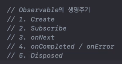 create๋ observable์ subscribeํจ์๊ฐ ํธ์ถ๋์ด์ผ ์คํ๋๋ค ์ดํ onNext, onError, onComplete์ ๋ฐ๋ผ ์ฒ๋ฆฌ๋๊ณ disposed ๋๋ค