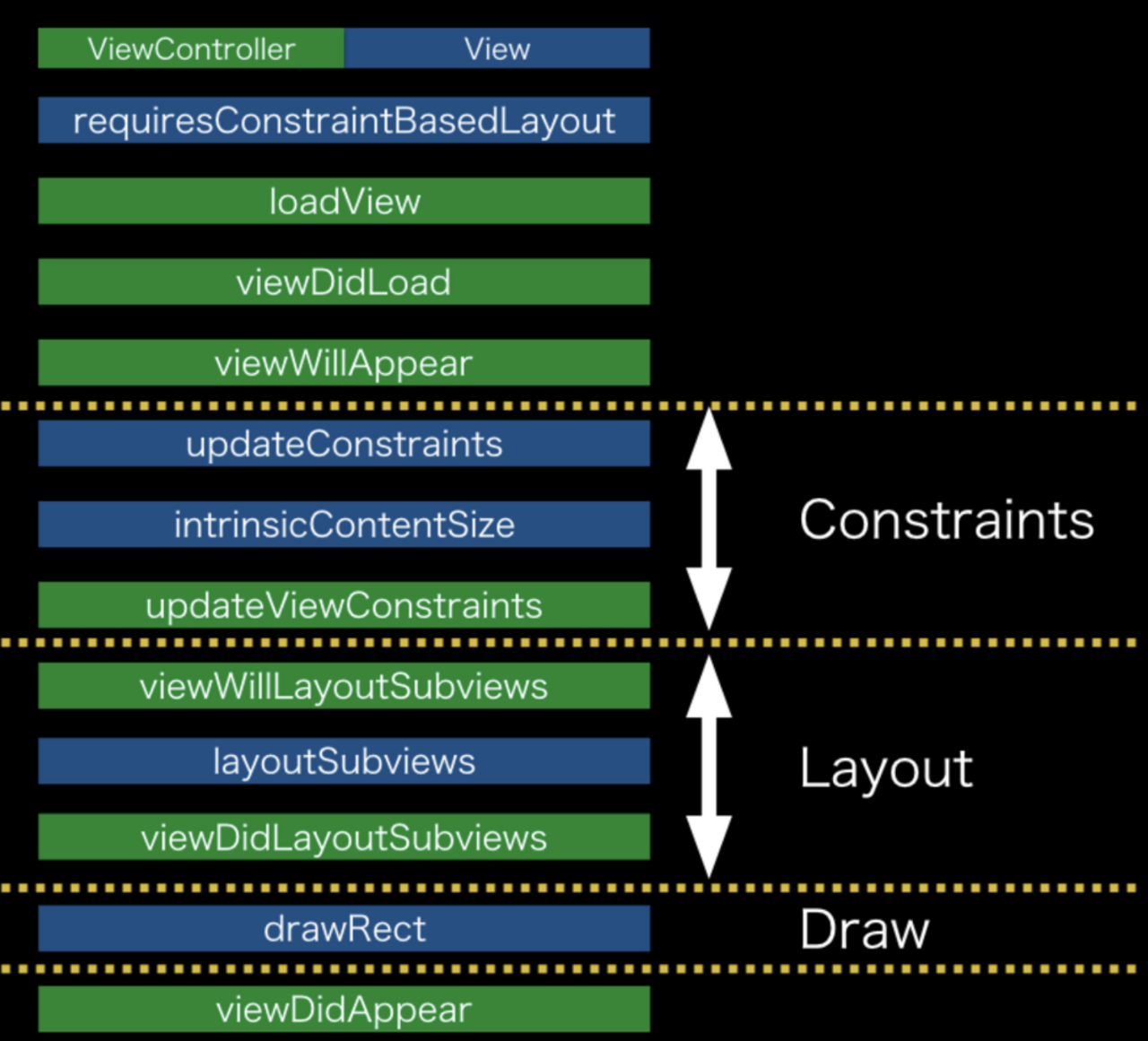 - Auto layout์์ ๋ทฐ๊ฐ ๋ ์ด์์๋๊ณ ๋ค์ ๊ทธ๋ ค์ง๋ ๊ณผ์ ์ ์ธ ๋จ๊ณ๋ก ๋๋๋ค