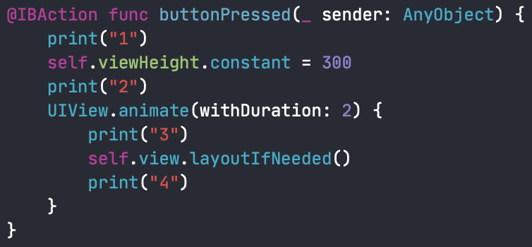 ๋ฐ๋ฉด Auto Layout์ Constraint ์์ฑ์ Animatableํ built-in animation ์์ฑ์ด ์๋๊ธฐ ๋๋ฌธ์ layoutIfNeeded๋ผ๋ ๋ฉ์๋์ ํธ์ถ๋ก ๊ทธ ์ฆ์ ๊ฐ์ ๋ฐ์ํ๋ ์์ ์ ํด์ฃผ๋ ์๋์ผ๋ก ๋ฐ๋์ ํด์ฃผ์ด์ผ ํ๋ค. layoutIfNeeded ๋ฉ์๋๋ก frame์ด ๋๊ธฐ์ ์ผ๋ก ์ฆ์ ๋ณ๊ฒฝ๋จ์๋ฐ๋ผ ์ ๋๋ฉ์ด์ ์์คํ ์ frame์ ๋ง์ง๋ง ์ํ๋ฅผ ์์์๊ธฐ ๋๋ฌธ! (๊ทธ๋ฆผ2)