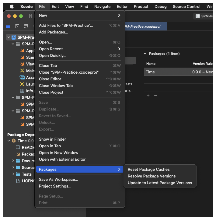 - Reset Package Caches : DerivedData์ ์๋ ํผํค์ง ์บ์๋ฅผ ์ญ์ ํ๊ณ ํจํค์ง๋ฅผ ๋ค์ ๋ถ๋ฌ์ต๋๋ค.