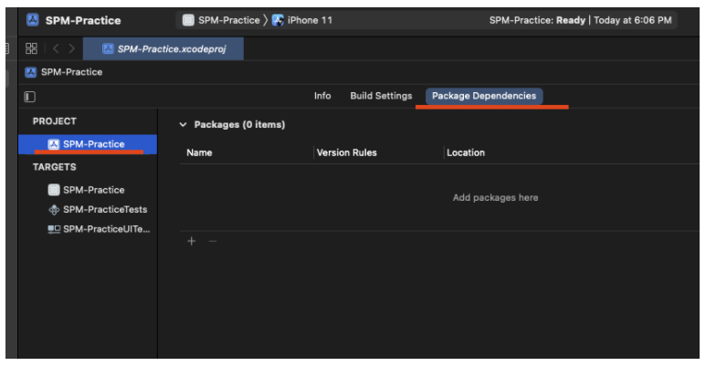 1. Xcode > ํ๋ก์ ํธ Target > Package Dependencies๋ก ์ด๋
