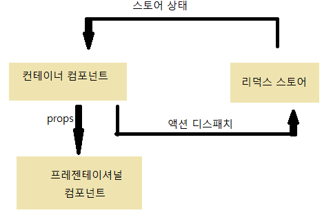 - 컨테이너 컴포넌트 : 리덕스와 연동되어 있는 컴포넌트. 리덕스로 부터 상태를 받아오기도 하고 리덕스 스토어에 액션을 디스패치 함.
