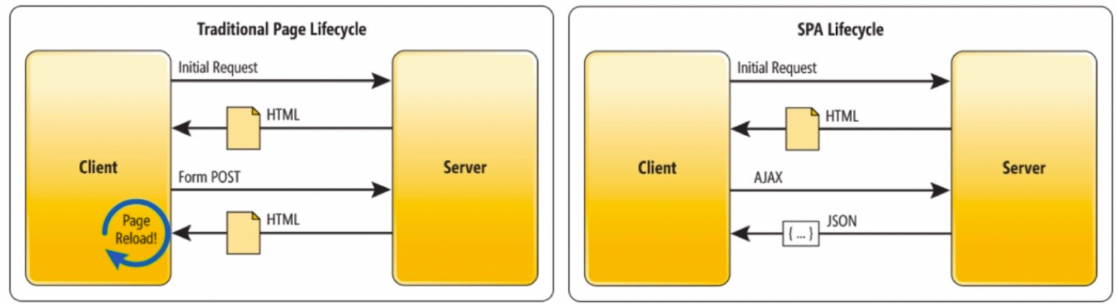 - SPA는 기본적으로 웹 애플리케이션에 필요한 모든 정적 리소스를 최초에 한번 다운로드한다. 이후 새로운 페이지 요청 시, 페이지 갱신에 필요한 데이터만을 전달받아 페이지를 갱신하므로 전체적인 트래픽을 감소할 수 있고, 전체 페이지를 다시 렌더링하지 않고 변경되는 부분만을 갱신하므로 새로고침이 발생하지 않아 네이티브 앱과 유사한 사용자 경험을 제공할 수 있다.