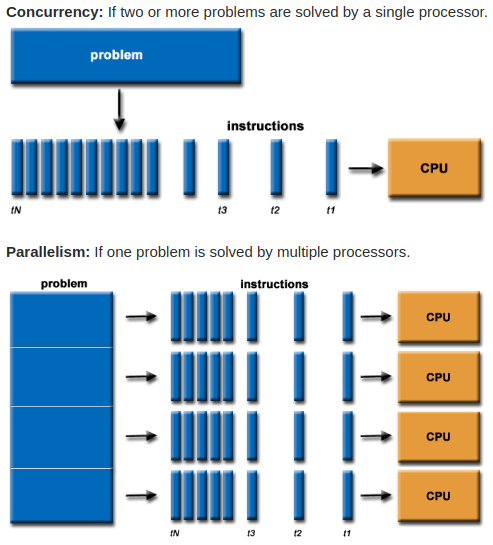- Parallelism is when tasks literally run at the same time, e.g., on a multicore processor.