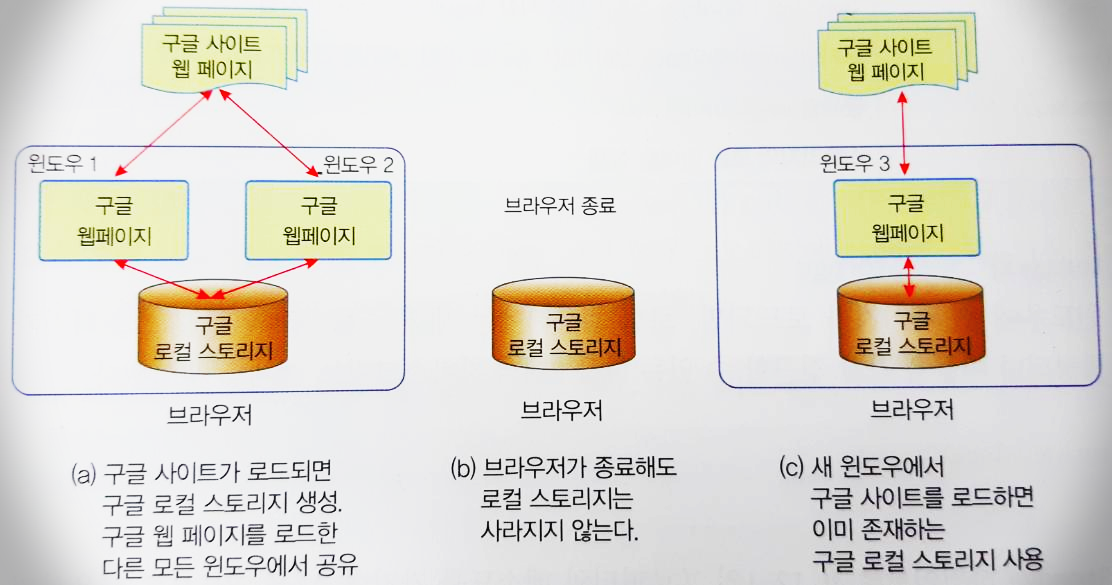 - 모든 브라우저 윈도우들이 공유하며 윈도우나 브라우저가 닫혀도 사라지지 않는 영구적인 저장소